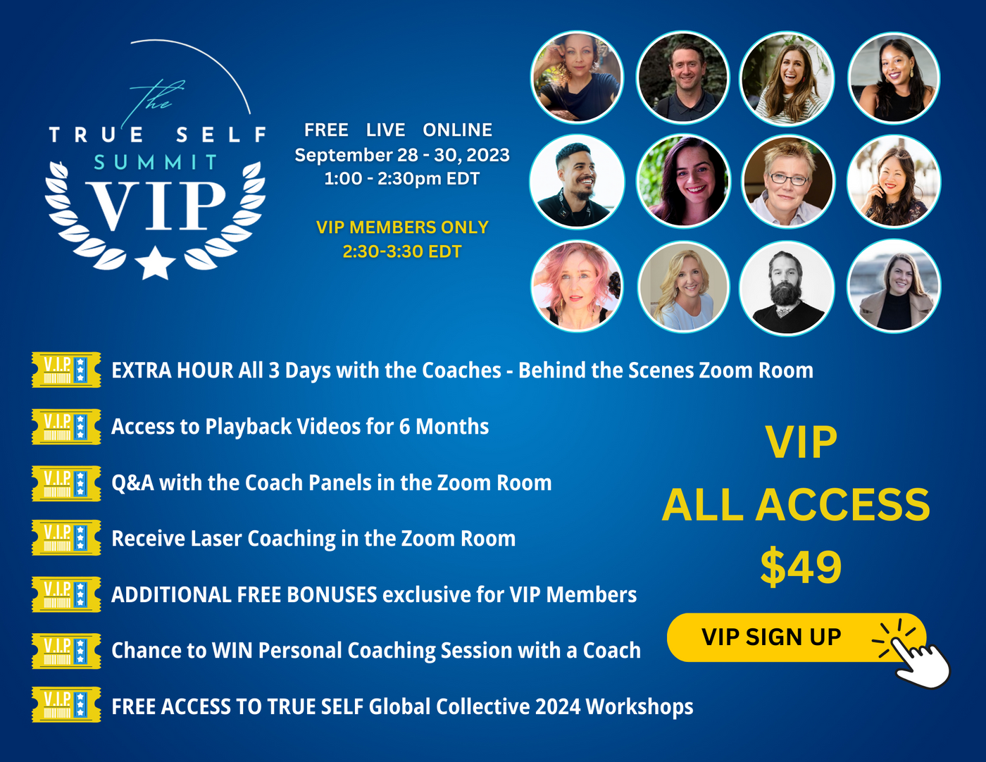 VIP Members will receive access to both the TRUE SELF Summit where the event information is stored and the VIP Member site where the Bonus Hour with the coaches links can be found to attend live or videos available for replays. You will also find additional VIP gifts and bonuses.